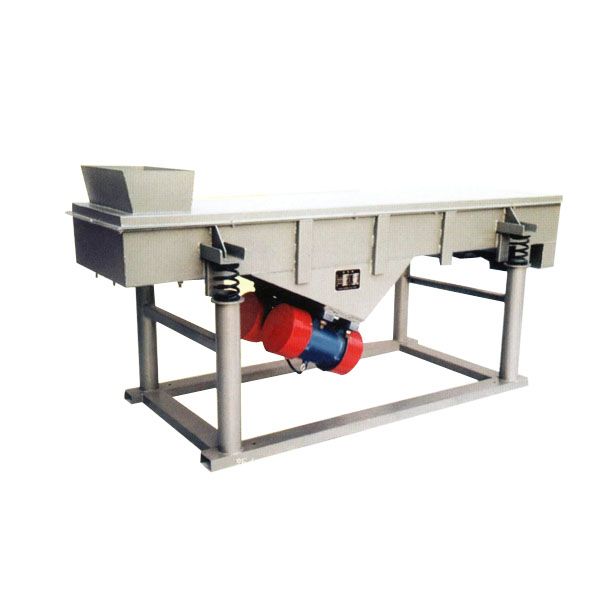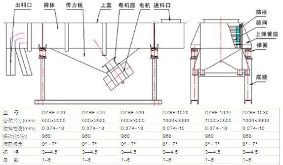 當(dāng)縱向安裝在篩體上的兩臺振動電機(jī)兩端的偏心塊便產(chǎn)生額定激振力,其產(chǎn)生在橫向的激振力相互抵銷,其縱向的激振力通過傳振體傳遞到整個篩面上,從而使篩面上的物料受其激振力而在篩網(wǎng)面上向出料口方向跳躍運動。小于篩孔的物料通過篩孔落到下層,大于篩孔的物料經(jīng)連續(xù)跳躍后,經(jīng)出料口流出,由于篩分過程合理,可將物料經(jīng)振動篩分級后,取得幾種不同顆粒的物料,完成物料的分級。